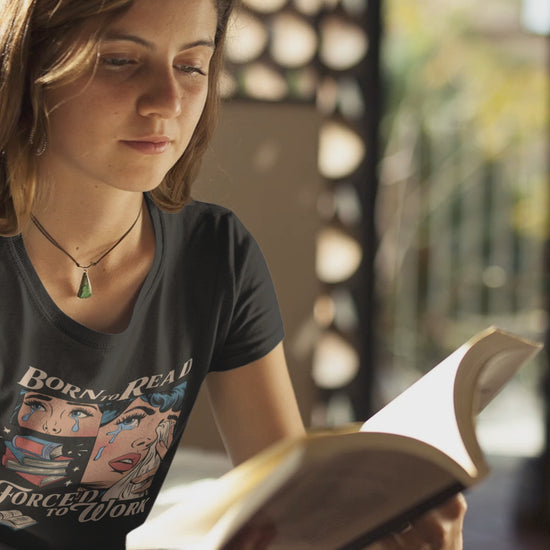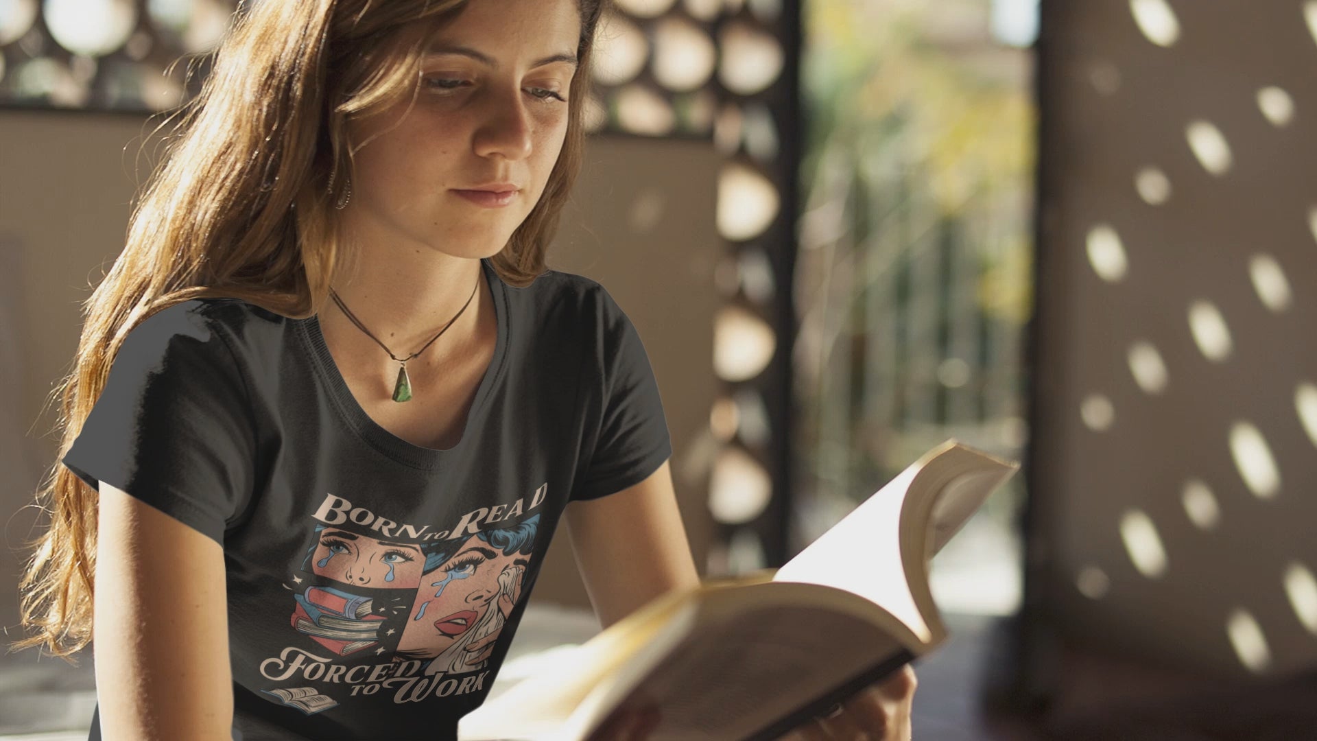 Dieses Shirt spricht aus, was sich alle Bücherwürmer heimlich denken: „Born to read, forced to work.“